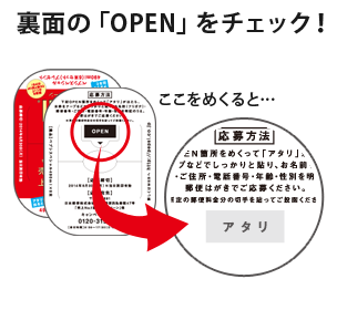 左記OPEN箇所をめくって「アタリ」が出たら、本券をテープなどでしっかりと貼り、お名前(フリガナ)・郵便番号・ご住所・電話番号・年齢・性別を明記のうえ、郵便ハガキでご応募ください。